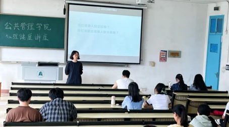 5月17日下午,校心理健康中心高杰老师在教4-302围绕“人际关系建构与人际关系应对”为公司研究生做心理健康讲座。高老师介绍了人际交往关系的特征、类型以及影响人际交往的因素,同时给大家分享了收获良好人际关系的小技巧。