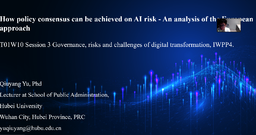 此次研讨会共有38个国家300余名学者参加,按主题划分为23个分论坛。俞秋阳博士在“数字时代的政策创新:趋势与挑战”分论坛上做了题为《人工智能风险的政策共识何以达成:来自欧盟的方法》(How policy consensus can be achieved on AI risk - An analysis of the European approach)的线上报告。